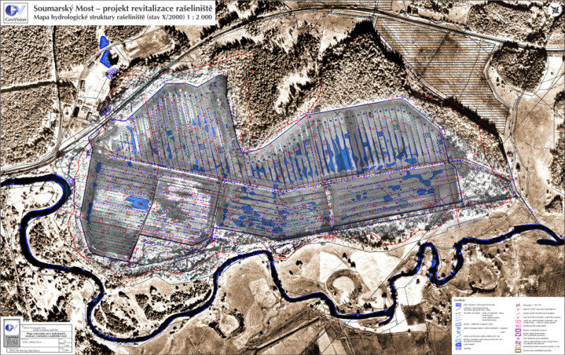 Podle požadavků zadavatele jsme již v roce 2000 na základě detailního průzkumu tehdejšího stavu vytěženého rašeliniště a zmapování jeho prostorové hydrologické struktury zpracovali návrh revitalizačních opatření. Cílem projektu byla především restaurace vodního režimu odvodněných ploch, obnova tvorby rašeliny a regenerace rašeliništní flóry i fauny na plochách zbavených vegetace. Projekt řešil plochu cca 85 ha, k úpravě bylo navrženo asi 25 km odvodňovacích kanálů.
